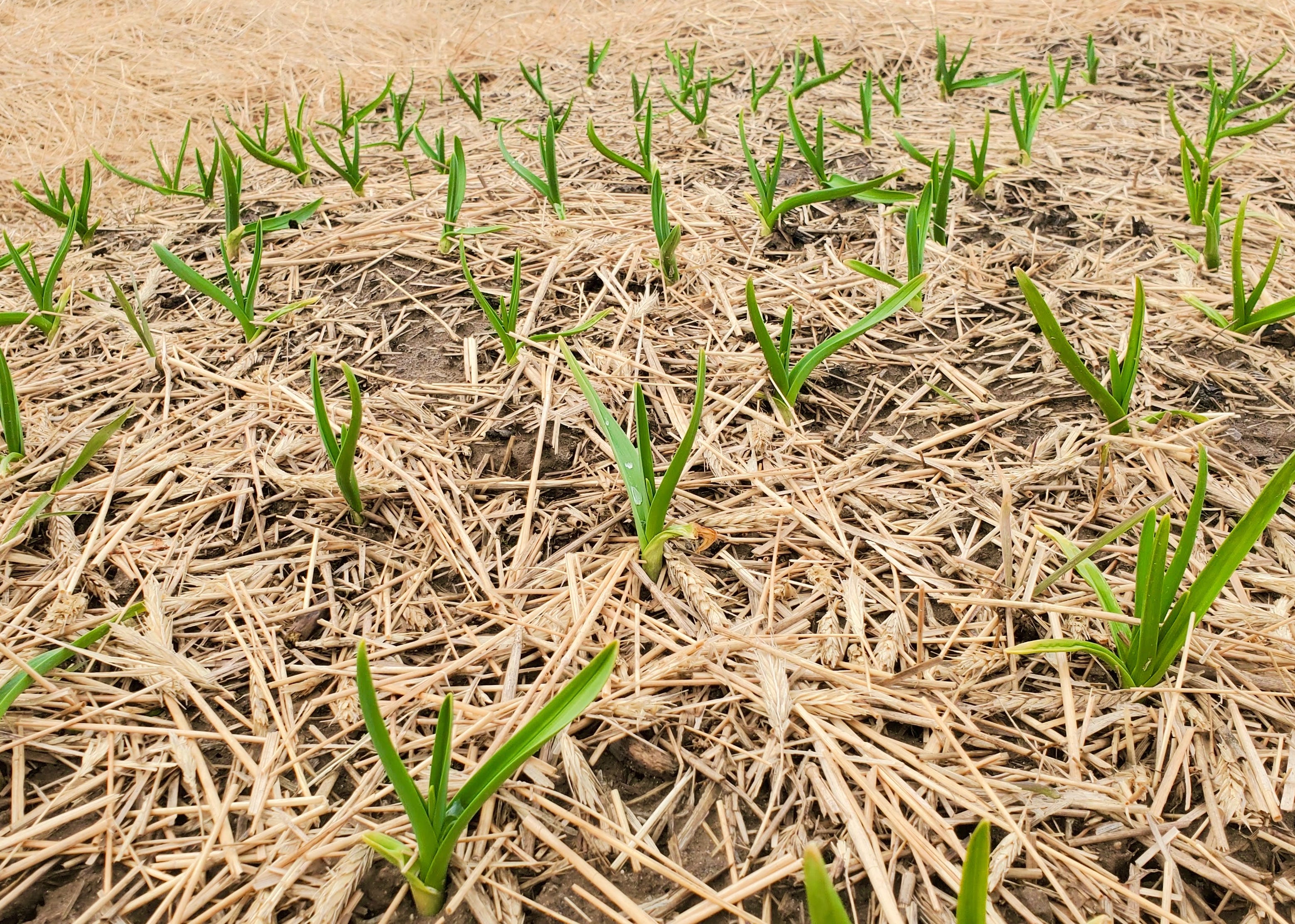 --- Garlic tips flushed up in midday heat—green fountains crisped nightly with frost. - In afternoon heat garlic rises—at daybreak frozen stiff as glass. - Afternoon—garlic blooms. Spring sunrise—garlic sparkles frozen stiff as glass.